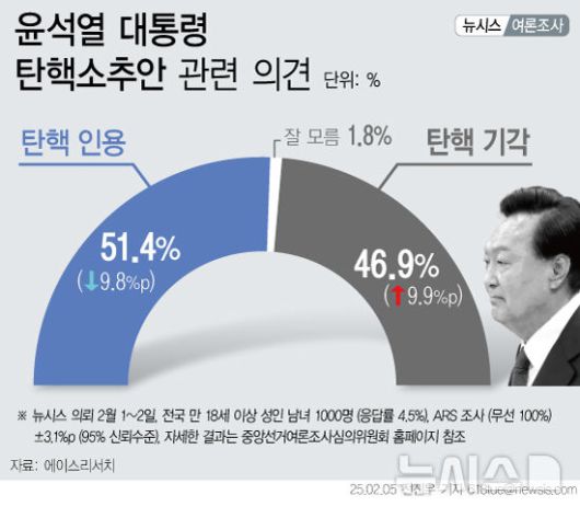 윤석열 대통령에 대한 탄핵소추안을 헌법재판소가 인용해야 한다는 응답과 기각해야 한다는 응답이 오차범위 내로 좁혀졌다는 여론조사 결과가 5일 나왔다.