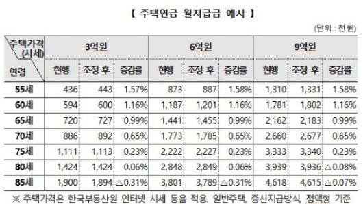 올해는 기대여명이 늘고, 이자율이 하락하면서 월지급금이 기존보다 평균 0.42% 증가하는 것으로 조정됐다. 증감률은 주택가격과 연령에 따라 -0.32%~1.58%까지 차이가 있다. 일례로 주택가격이 12억원 이하이며, 55~65세 가입자는 월 3만원이 더 오르는 것으로 나타났다.