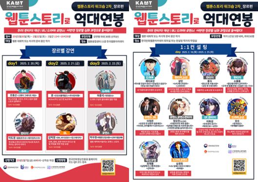 6개 장르별 강의는 20일부터 22일까지, 웹툰 데뷔작 또는 차기작을 준비 중인 신청자의 작품을 기반으로 한 1:1 컨설팅은 17일부터 25일까지 진행된다.