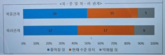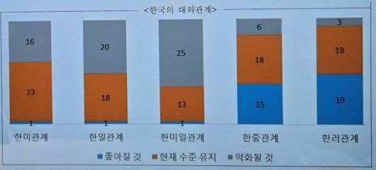 한·미 관계는 ‘유지’(23명, 57.5%)될 것이란 전망이 과반이었고, ‘약화’(16명, 40%)가 뒤를 따랐다. ‘개선’ 의견은 1명(2.5%)뿐이었다. 한·일 관계는 50%가 ‘약화’를, 한·미·일 관계는 62.5%인 25명이 ‘약화’를 예상했다. 한·중 관계는 ‘유지’(18명, 45%)가 절반에 가까웠고, ‘개선’(15명, 37.5%) 예상이 ‘약화’(6명, 15%)를 크게 앞질렀다.