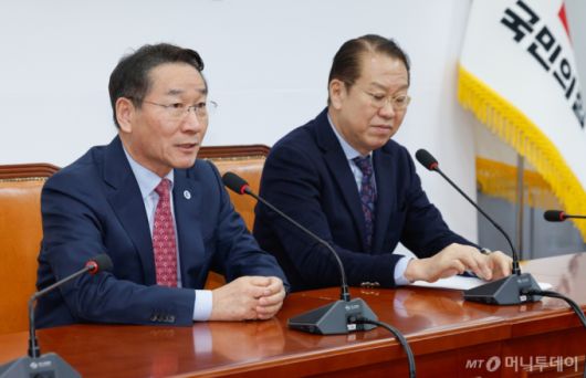 대한민국시도협의회장인 유정복 인천시장(왼쪽)이 5일 서울 여의도 국회에서 권영세 국민의힘 비상대책위원장을 예방하며 인사말 하고 있다. /사진=뉴스1 |