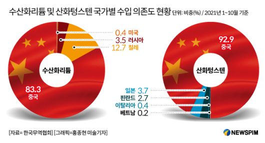 대부분 중국의존도가 80~90% 수준으로 높은 편이어서 대책을 강구해야 하는 상황이다. 다만 텅스텐과 몰리브덴을 제외한 나머지 3개 품목은 국내 생산이 가능해 문제가 없는 것으로 파악됐다.