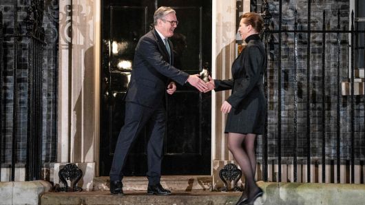▲ 영국의 키어 스타머 총리가 4일 런던 중심부 다우닝가 10번지에서 메테 프레데릭센 덴마크 총리와 인사를 나누고 있다.