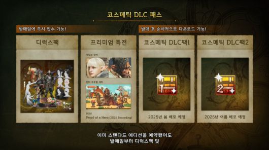 ▲디럭스 에디션에는 헌터·동반자·세크레트 외형 아이템 외에 얼굴 장식, 무기 장식, 체스쳐, 얼굴 커스터마이징 요소, 이모티콘이 포함된다. ▲프리미엄 디럭스 에디션에는 디럭스 에디션의 구성물뿐만 아니라 특전 BGM ‘Proof of a Hero’, 덧입는 장비, 헌터 프로필 등의 특전과 함께 추후 배포 예정인 코스메틱 DLC팩 1&2까지 포함된다. 각 에디션의 구성물은 추후 개별로 구매할 수 있으며 코스메틱 DLC팩 1탄은 봄, 2탄은 여름에 배포될 예정이다.