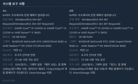 추가로 쇼케이스에서 발표된 내용은 아니지만, GPU 요구 사항이 낮아진 것을 확인할 수 있었다. 캠콤 측은 지난 1월 19일 독일 공식 SNS를 통해 ‘렌더링 문제를 해결했으며 지속적으로 개선을 진행 중’이라고 말한 바 있다. 21일에는 권장 그래픽 카드 요구사항을 낮추는 방향으로 검토 중이라고 밝히기도 했다.