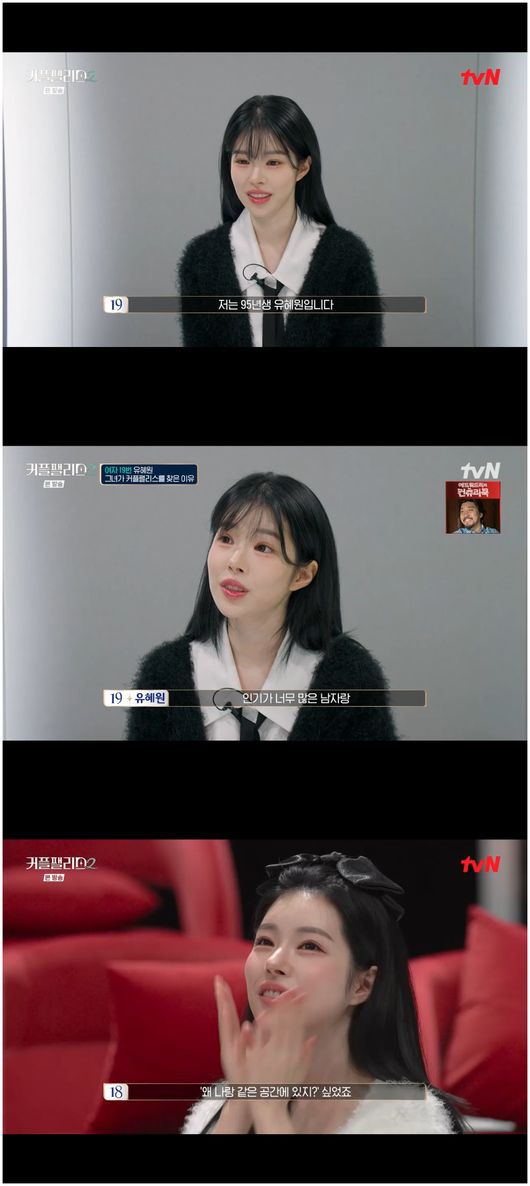 5일 방영한 tv’N커플팰리스2’에서는 모델 유혜원이 등장했다. 모델 유혜원은 등장부터 이목을 끌었다. 수많은 여성 출연자들이 여성 대기실에서 유혜원을 알아보고 "그 분밖에 안 보이더라", "너무 예쁜 분이 있어서 계속 쳐다 봤다", "그분 맞죠?"라며 연신 놀라움을 표했다.