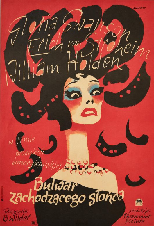 과거의 인기를 다시 찾을 수 있다는 망상에 사로잡힌 몰락한 배우 노마 데스몬드의 이야기를 담은 1950년 할리우드 영화 ‘선셋대로’. 오리지널 포스터는 주연의 얼굴을 사진으로 강조하지만, 폴란드 작가 발데마르 시비에지가 그린 포스터는 짙푸른 아이섀도와 문어 다리 같은 머리칼로 데스몬드의 광기를 묘사한다.