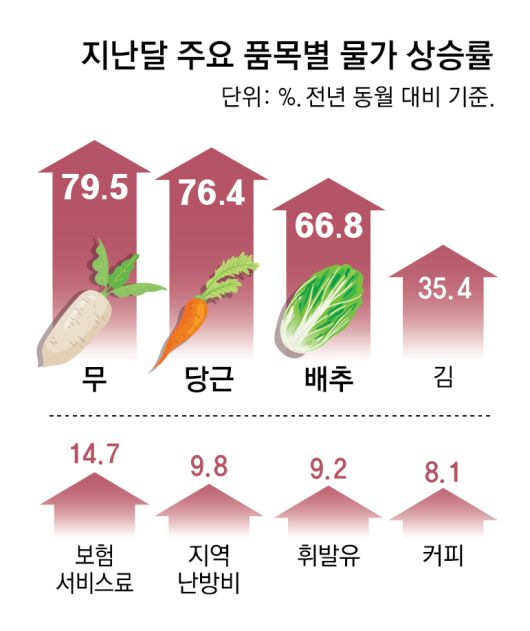 전체 농축수산물 물가는 1.9% 상승했지만 채소류(4.4%)와 축산물(3.7%), 수산물(2.6%) 모두 전체 물가 상승률을 웃도는 상승 폭을 보였다. 특히 무 값은 전년보다 79.5% 뛰었고, 배추 값은 66.8% 오르며 2022년 10월(72.5%) 이후 2년 3개월 만에 가장 큰 폭의 상승률을 보였다. 기상 악화로 산지 출하 물량이 감소한 게 큰 영향을 미쳤다. 정부는 ‘금(金)값’이 된 배추 가격을 잡기 위해 중국산 배추를 수입해 국내 시장에 공급할 예정이다. 김은 35.4% 올라 1987년 11월(42%) 이후 37년 2개월 만에 최고 상승률을 보였다.