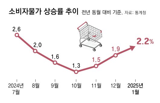5일 통계청이 발표한 ‘1월 소비자물가 동향’에 따르면 지난달 소비자물가는 1년 전보다 2.2% 상승했다. 지난해 10월 1.3%까지 떨어지며 안정세를 보였던 소비자물가 상승률은 11월(1.5%)부터 다시 오르기 시작하더니 12월(1.9%)에 이어 지난달까지 3개월 연속 상승하며 2%대로 재진입했다.