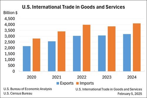 5일(현지시간) 미 상무부는 지난해 12월 무역수지 적자가 984억달러를 기록했다고 밝혔다. 이는 2022년 3월 이후 최대 규모의 무역 적자다.