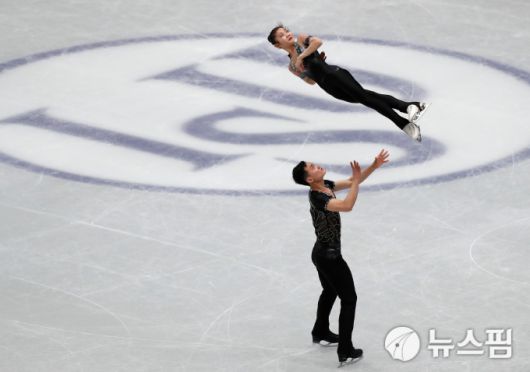 [사이타마 로이터=뉴스핌] 오영상 전문기자 = 20일 일본 사이타마 슈퍼아레나에서 열린 2019 국제빙상경기연맹(ISU) 세계피겨선수권대회 페어 부문에 출전한 북한의 렴대옥(위)과 김주식이 연기를 펼치고 있다. 2019.03.20. |