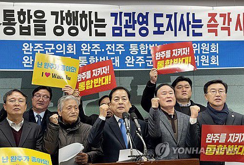 (전주=연합뉴스) 임채두 기자 = 전북 완주군의회와 완주·전주 통합 반대 완주군민 대책위원회는 6일 "김관영 전북특별자치도지사는 통합 찬성 단체와 전주시의 입장만을 대변하면서 통합을 강행하고 있다"고 비판했다.