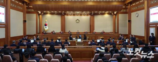 6일 서울 종로구 헌법재판소 대심판정에서 열린 탄핵 심판 6차 변론에 문형배 헌법재판소장 직무대행을 비롯한 헌법재판들이 착석해 있다.