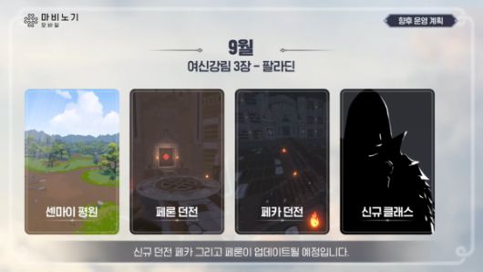 - 9월 : 여신강림 3장-팔라딘, 센마이 평원, 페론 던전, 페카 던전, 신규 클래스