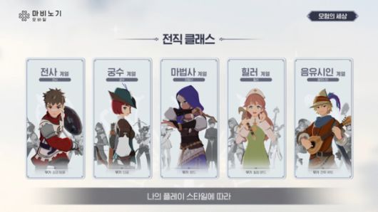 마비노기M은 오픈 스펙으로 총 5가지 전투 클래스를 제공한다. 전사,궁수, 마법사, 힐러, 음유시인이다. 캐릭터 생성 시 1차 전직에 해당하는 견습 클래스로 시작한다. 무기를 교체해 자유롭게 클래스를 변경한다.