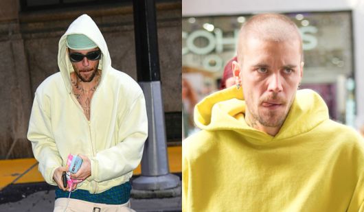 저스틴 비버는 옅은 노란색 스웨트셔츠의 후드를 쓴 차림이었다. 스웨트셔츠 안에는 상의를 입지 않았고, 바지는 엉덩이까지 내려 입어 팬티가 고스란히 보였다.