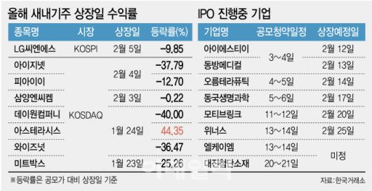 LG씨엔에스뿐 아니라 올해 상장한 기업들의 성적표는 낙제점이다. 올해 상장한 8개 기업의 공모가 대비 상장 첫날 수익률은 평균 -14.74%를 기록했다. 지난해 같은 기간(2024년 1월2일~2월5일) 신규 상장한 5개 종목의 상장일 수익률 평균이 178.36%였던 것과 대조되는 모습이다.