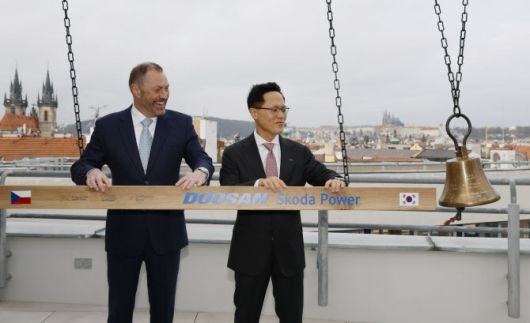 6일 체코 프라하 증권거래소에서 열린 두산스코다파워 상장 기념식에서 두산에너빌리티 박상현 사장(오른쪽)과 프라하 증권거래소 페트르 코블리츠 CEO가 증시 상장을 알리는 종을 울리고 있다.(사진=두산에너빌리티.) |
