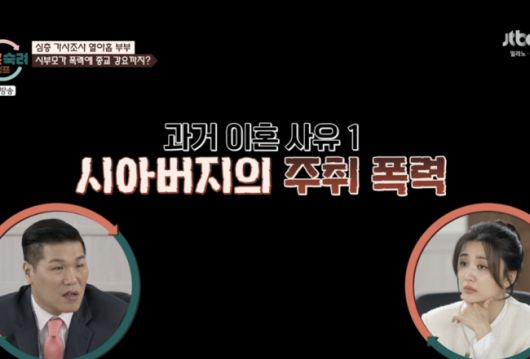 아내는 “스무살에 혼전임신으로 시댁에서 생활, 너무 힘들었다”며 “친정 아버지가 술 마시면 집에서 물건 다 부쉈다, 엄마와 나를 괴롭혔다”며 “아버지 피해 일찍 결혼을 결심했는데 내 아버지랑 똑같은 사람이 또 있더”며 라알고보니 시아버지의 주취 폭력이 있었다고 했다. 시아버지가 가족을 괴롭히는 술버릇이 있었던 것.