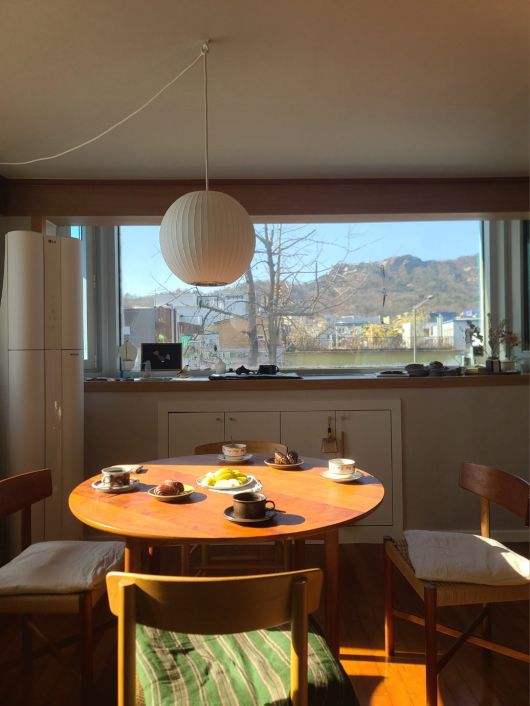 서울 종로구 서촌에 있는 ‘하우스씨’의 집도 기억에 남는다. 이 집은 대로변에 있는데 창문 밖으로 은행나무가 숲속인 양 가깝게 보인다. 봄에는 녹색, 가을에는 노란색이 커다란 덩어리로 쏟아질 듯 가깝게 펼쳐진다. 창문 안쪽으로 있는 진열장 위에는 유리새를 포함해 시간이 날 때마다 부부가 한 점씩 사 모은 공예품이 가득하다. 식물도 넘치도록 많고 목공을 배우며 직접 만든 수납장과 선반에도 기꺼이 자리를 내주는 중이다.