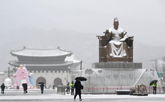 전국 대부분 지역에 눈이 내린 7일 오전 서울 종로구 광화문광장 내 세종대왕상에 눈이 가득 쌓여 있다. 기상청에 따르면 눈은 이날 중으로 대부분 지역에서 그칠 것으로 보이며, 추위는 주말까지 지속되다 다음 주 초부터 차츰 풀릴 것으로 예상된다. 임세준 기자