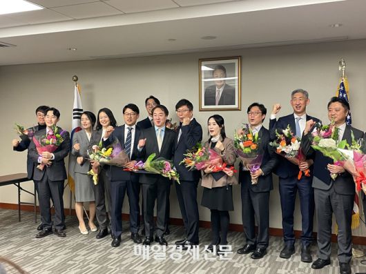 6일(현지시간) 미국 뉴욕총영사관에서 김의환 총영사가 뉴욕 주재 한인 금융인들에게 경제부총리 표창장을 전수하고 함께 화이팅을 외치고 있다. 표창장 수상자는 샌더 허 한인금융인협회(KFS) 공동의장, 김정주 중소기업은행 뉴욕지점장, 박용호 금융감독원 뉴욕사무소장, 이동재 현대해상화재보험 뉴욕법인장, 이승식 하나은행 미주본부장, 이진 수출입은행 뉴욕사무소장, 이진아 삼성자산운용 뉴욕법인장, 노진영 한국은행 뉴욕사무소 차장, 안인태 KDB산업은행 뉴욕지점 팀장, 유설 뉴욕총영사관 책임실무관, 정현빈 국민연금관리공단 뉴욕사무소 과장 등 12명이다. <사진=윤원섭 뉴욕 특파원> |