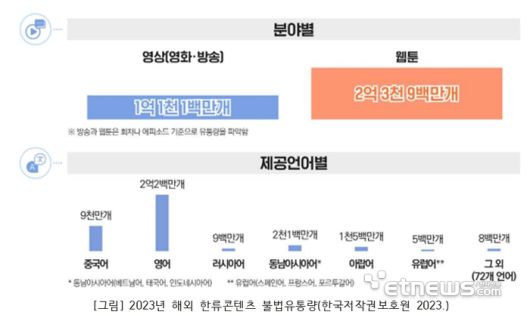 한국저작권보호원의 '2023 해외 한류콘텐츠 침해 실태조사' 보고서에 따르면, 2023년 해외 한류 콘텐츠 불법유통량은 전체 3억5000만개로 영상의 경우 약 1억1100만개, 웹툰의 경우 약 2억3900만개로 나타나며 대부분의 한류 콘텐츠들은 영어, 중국어 등으로 불법 유통되고 있다. 한류 콘텐츠의 인기에 이어 해외 한류 콘텐츠들이 불법 유통되는 한편 해외 현지어 등으로 불법 번역되고 있는 상황이다.
