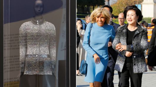 국립한글박물관에 기증돼 2022년 3월 인천국제공항 제1여객터미널에 전시된 샤넬 한글 재킷(왼쪽)과 2018년 10월 15일 김정숙 여사가 프랑스 국빈 방문 당시 샤넬 한글 재킷을 입고 에마뉘엘 마크롱 대통령 배우자 브리지트 마크롱 여사와 파리 루브르 박물관에 입장하는 모습. 연합뉴스 |