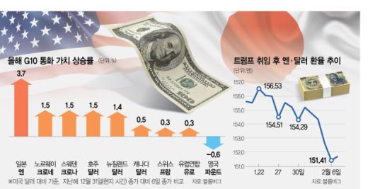 니혼게이자이신문 등에 따르면 7일 도쿄외환시장에서 달러당 엔화 환율은 한때 전 거래일보다 1.0% 하락한 150.97엔을 기록했다. 이는 지난해 12월 10일(150.90엔) 이후 최저(가치 최고) 수준이다. 지난해 미국 연방준비제도(Fed·연준)의 금리 인하 지연으로 161엔대까지 추락했던 달러 대비 엔화 가치는 지난해 말 150엔까지 올라섰다가 강(强)달러에 다시 158엔 선을 기록하는 등 높은 변동성을 보여왔다.