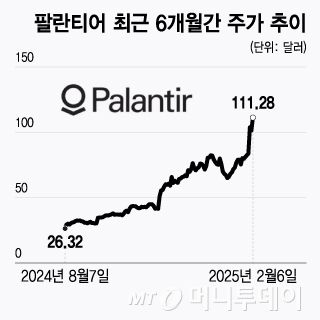 팔란티어 주가는 지난해 340% 치솟아 오른데 이어 올해도 47% 급등했다. 나스닥지수가 올들어 2.5% 오른데 그쳤다는 점을 감안하면 놀라운 상승세다.