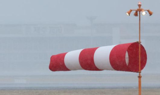 7일 제주공항에 강풍경보와 급변풍경보가 발효된 가운데 다른 지방 폭설의 영향까지 겹쳐 결항한 항공편들이 속출하고 있다. 이날 오후 눈보라가 치는 제주공항 활주로의 바람자루가 강풍의 세기를 가늠케 한다. [사진=연합뉴스]