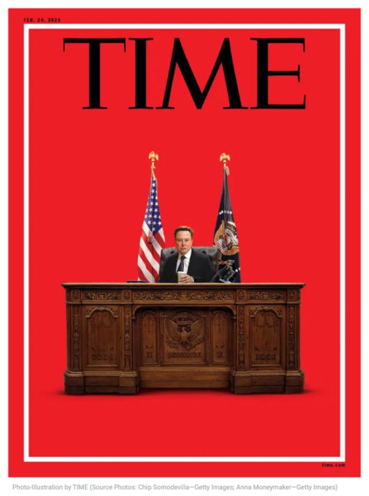 타임지가 이날 공개한 이달 24일자 발행본 표지 사진은 트럼프 대통령의 '최측근' 일론 머스크 테슬라 최고경영자(CEO)가 백악관 대통령 책상 위에 당당하게 앉아 있는 모습을 묘사하고 있다. 현재 머스크가 이끄는 정부효율부(DOGE)가 미국 연방정부 전반을 돌아다니며 예산 삭감과 공무원 해고 등 무소불위의 권력을 휘두르고 있는 상황을 표현한 것으로 보인다.