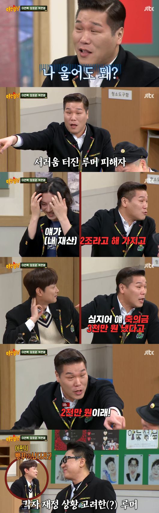 이수근은 "이상민은 축의금에 손댔다고 하던데"라고 농담을 했고, 침묵을 유지하는 이상민에 민경훈은 "어쩐지 구멍났더라"라고 너스레를 떨어 모두를 폭소케 했다.