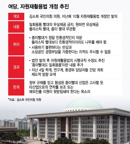 정부는 내심 국회가 나서주길 바라고 있다. 종이빨대 제조사 등 이해관계자들이 있기 때문에 정치권이 나서 상황을 조율해줬으면 하는 분위기다. 이와 관련해 현재 국회엔 환경노동위원회 소속 김소희 국민의힘 의원이 발의한 '자원재활용법 개정안'이 계류돼있다.