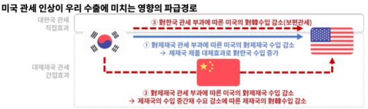 보고서는 각국의 대미국 수출 영향은 미국 수입시장 점유율, FTA 체결 여부, 추가 관세를 적용받는 중국·캐나다·멕시코와의 산업 경합구조 등에 따라 달라진다고 설명했다. 이에 우리의 수출 분야 중 미국에서 중국·캐나다·멕시코 제품과 경합도가 높은 수송기기(11억7000만 달러)와 전기·전자제품(5억5000만 달러) 등은 가격경쟁력 상승으로 대미 반사이익이 가장 클 것으로 나타났다.