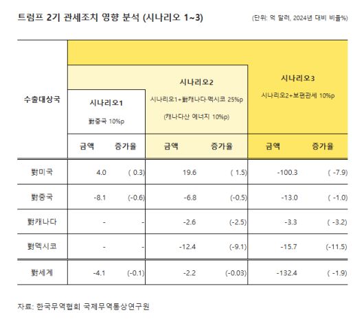 보고서는 시나리오별로 다양한 변수를 고려하고 여기에 따른 영향을 파악했다. 시나리오는 ▷對중국 10%p 추가 관세부과(시나리오1) ▷시나리오1+對캐나다·멕시코 25%p 관세부과(시나리오2) ▷시나리오2+보편관세 10%p 부과(시나리오3) 총 3단계로 구성됐다.