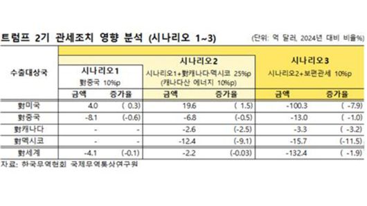 ▲ 트럼프 2기 관세조치 영향 분석(시나리오 1∼3) (사진=한국무역협회 보고서 갈무리)