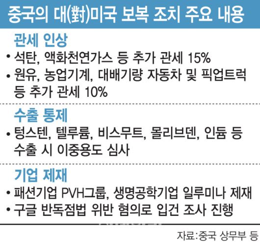 미국의 도널드 트럼프 행정부가 중국에 대한 10%의 보편 관세에 대응해 중국 정부는 관세 인상과 수출 통제, 미국 기업 제재 등 조치를 준비하고 있다. 당장 10일부터 무연탄·합금철·액화천연가스(LNG) 등 8개 품목에 대해 15%. 원유·농기계, 대형 배기량(4000cc 이상) 자동차 및 픽업트럭 등 72개 항목에 대해서는 10%의 추가 관세를 각각 부과한다.