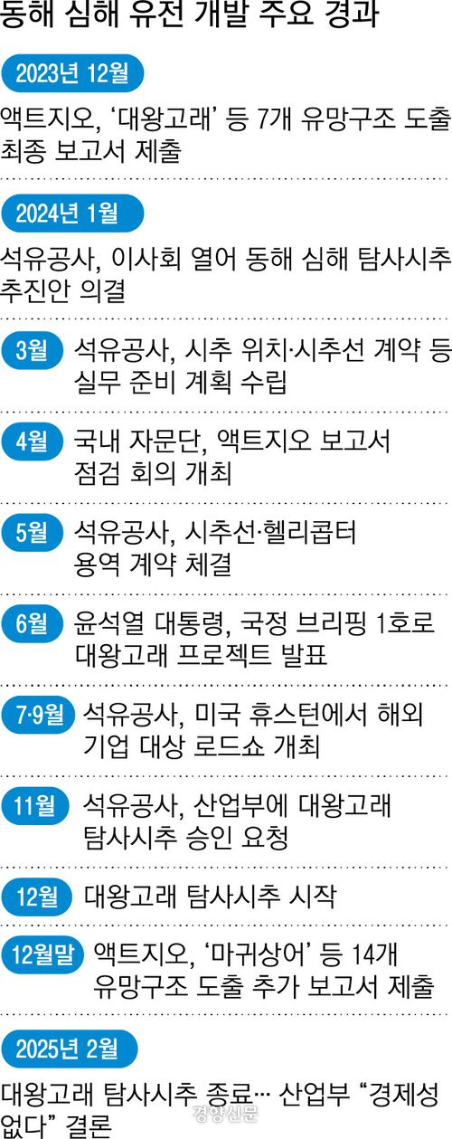 A. 당연히 1차공이었던 대왕고래 탐사시추는 실패로 봐야 한다는 입장도 있다. 탐사사추의 주목적이 탄화수소(석유·가스 등을 구성하는 유기화합물) 부존 여부를 확인하는 것인데, 경제성 있는 규모의 탄화수소를 발견하지 못한 건 실패라는 입장도 있다. 익명을 요구한 석유업계 전문가는 “시험에서 떨어진 걸 실패로 보지 않고 다음 도전을 위한 하나의 과정으로 보려면 볼 수도 있겠지만, 경제성 있는 발견에 실패한 건 분명하지 않냐”고 말했다.