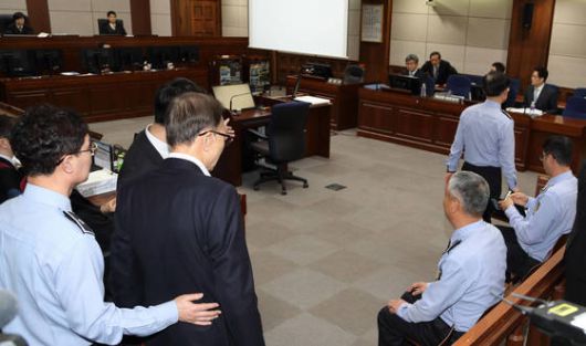 재판 장면이 공개되는 경우는 드물다. 그 이례적 경우 중 하나인 이명박 전 대통령의 재판 출석 모습을 참고해 법정의 내부 모습을 엿보자. 사진을 기준으로 왼쪽 윗부분에 재판장을 비롯한 판사들이 앉아 있고, 오른쪽 윗부분에 변호사들이 앉아 있다. 검사석은 맨 왼쪽 가운데 법정 경위 옆으로 살짝 보인다. 중앙포토
