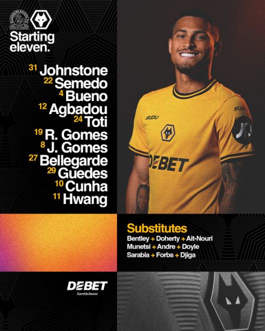 울버햄튼은 3-4-2-1 포메이션을 내세웠다. 최전방은 마테우스 쿠냐가 나섰고, 그 밑을 황희찬, 곤살루 게드스가 받쳤다. 허리는 로드리고 고메스, 주앙 고메스, 장리크네르 벨레가르드, 넬송 세메두가 구성했고 쓰리백은 에마뉘엘 아그바두, 산티아고 부에노, 토티 고메스가 책임졌다. 골문은 샘 존스톤이 지켰다.