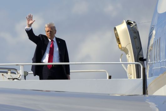 도널드 트럼프 미국 대통령이 9일(현지시간) 플로리다주 팜비치 국제공항에서 미 대통령 전용기 에어포스원에 탑승하기 전 손을 흔들고 있다.[AP] |