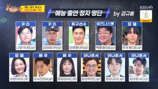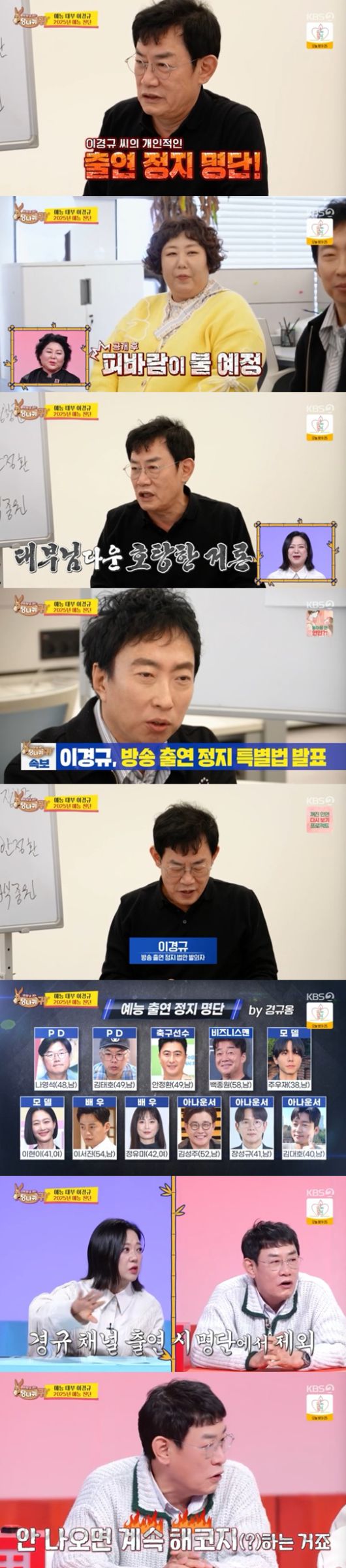 이경규는 출연 정지 명단을 공개했다. 그는 "우리가 얘기했는데도 방송 출연을 하면 가택 연금에 들어간다"라며 단호한 모습을 보였다.