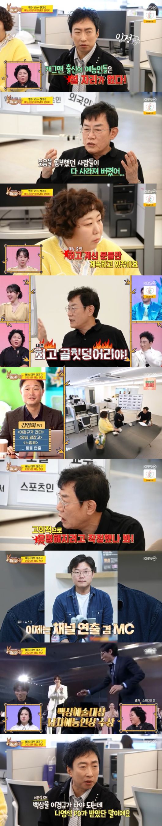 9일 방송된 KBS 2TV '사장님 귀는 당나귀 귀'에서는 이경규가 예능프로그램의 판도를 얘기하는 모습이 전파를 탔다.