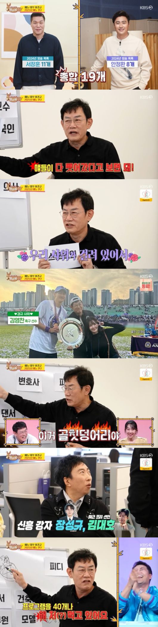 이경규는 "그 둘이 하는 프로그램이 열 몇 개다. 얘들이 다 뺏어갔다고 하면 돼. 감독을 하라. 안정환은 왜 오락 프로에서 감독을 하는 거냐"라며 버럭했다.