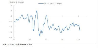 최 연구원은 앞서 중국 정부가 도널드 트럼프 미국 행정부의 10% 대중국 관세에 대한 대응 차원에서 이날부로 미국산 원유와 LNG에 각각 10%, 15% 관세를 부과하기로 한 사실을 언급하며 "미국의 2대 원유 수입고객인 중국의 보복은 분명 수요에 악재다. 이로 인한 불확실성이 서부텍사스산원유(WTI)-두바이유 가격 스프레드 하락을 통해 반영되고 있다"고 진단했다.