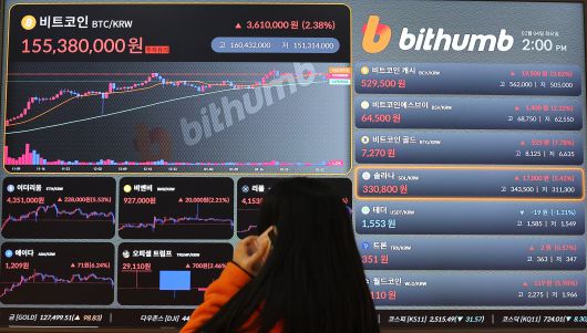 서울 서초구 빗썸라운지 전광판에 비트코인 등 가상자산 시세가 표시되고 있다. /뉴스1 |
