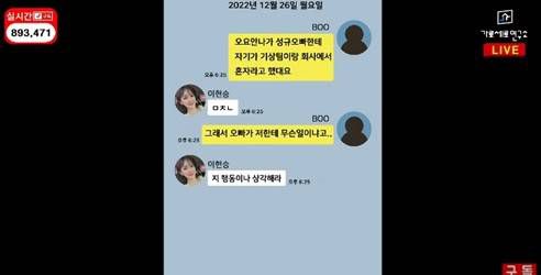 이어 "억울하면 김가영 기상캐스터에게 항의하세요. 장성규 당신이 김가영에게 오요안나 이야기한거 사실 아닙니까? 김가영과 이현승의 카톡 내용을 보고 말을 하세요~ 왜 김가영에게 항의하지 않고 가세연에 와서 난리를 치나요? 일름보~ 고자질쟁이~ 장성규 씨~"라고 비꼬았다.