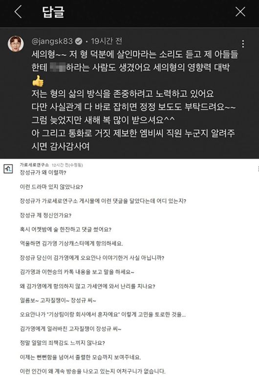 이에 장성규는 8일 가세연 댓글을 통해 "저 형 덕분에 살인마라는 소리도 듣고 제 아들들에게 죽으라는 사람도 생겼어요. 세의형 영향력 대박"이라며 공개 저격했다. 또한 "저는 형의 삶의 방식을 존중하려고 노력하고 있어요. 다만 사실관계 다 바로잡히면 정정 보도도 부탁드려요~~"라고 강조, "아 그리고 통화로 거짓 제보한 엠비씨 직원 누군지 알려주시면 감사감사여"라고 덧붙였다.