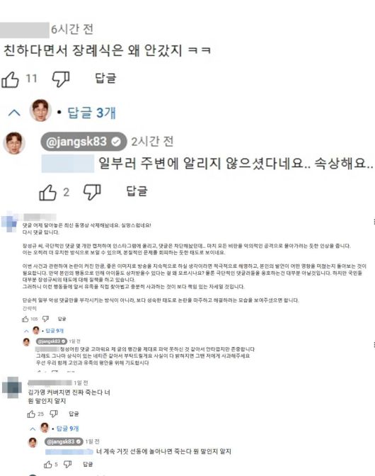 이어 "김가영 커버치면 죽는다 너 뭔말인지 알지"라는 댓글에 장성규는 "너 계속 거짓선동에 놀아나면 죽는다 뭔 말인지 알지"라고 받아쳤다.
